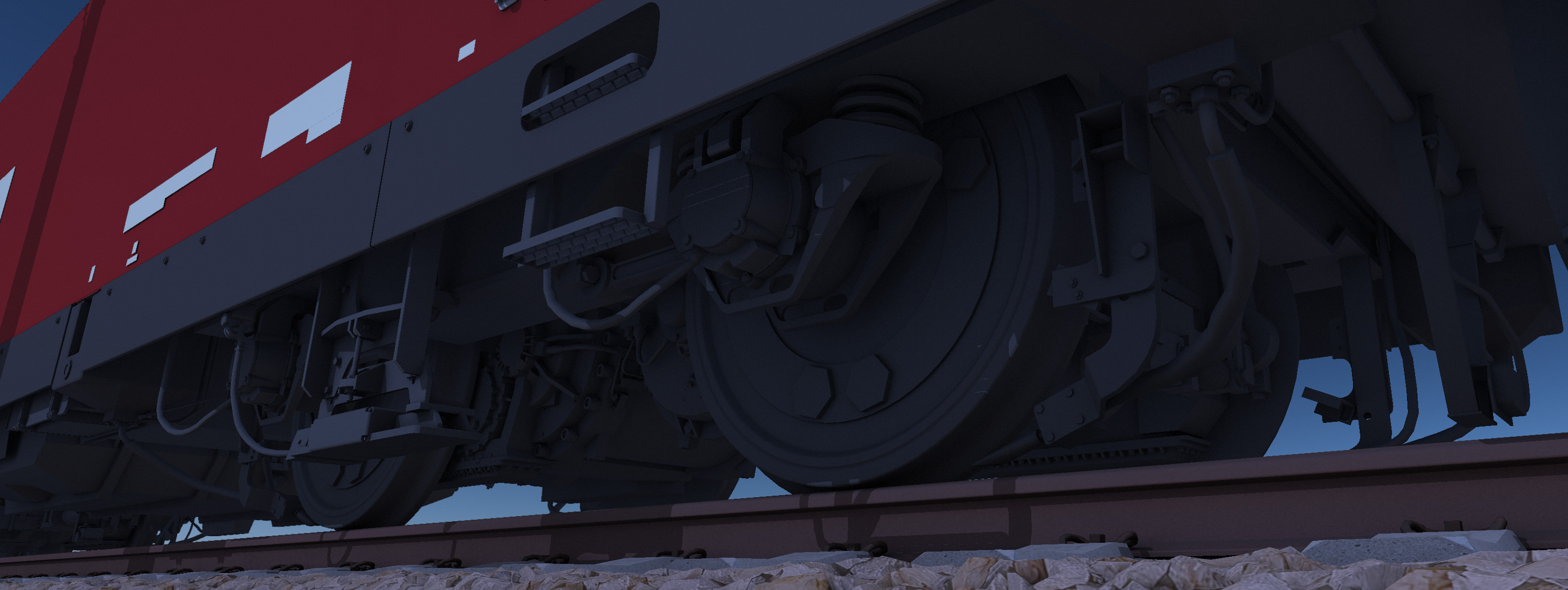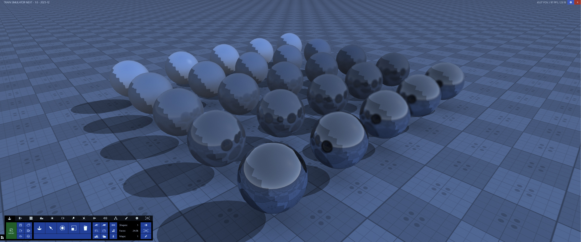Anstatt auf veraltete pixelbasierte Lösungen zu setzen, setzt die Game Engine vom Train Simulator NEXT auf Raytracing. Dadurch lassen sich Schatten geometrisch korrekt berechnen und volumetrische Rechnungen berücksichtigen ihre Umgebung korrekt. Auf dem Bild sieht man eine Oberfläche ohne Textur oder vorgebackene Hilfstexturen. Die sichtbare Selbstschattierung (Ambient Occlusion) ist natürlich und gibt die volumetrische Tiefe des Objektes korrekt wieder.